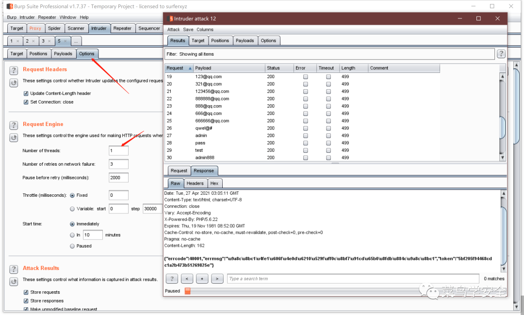 接下来尝试intruder模块,和正常暴力破解是一样的,不用管Token,直接配置好相关参数,这里需要线程或延时调低一点,太快的话获取Token的速度跟不上,然后就可以直接冲冲冲了,效果如下