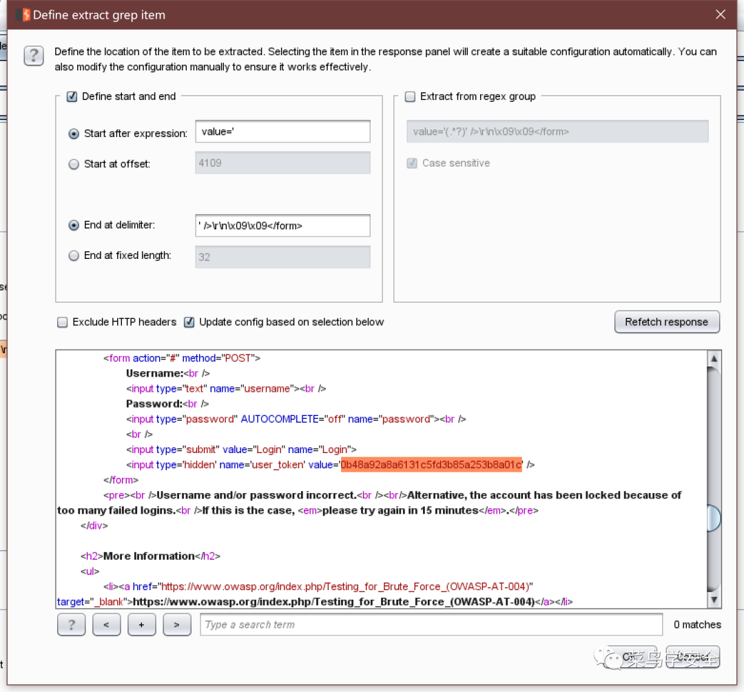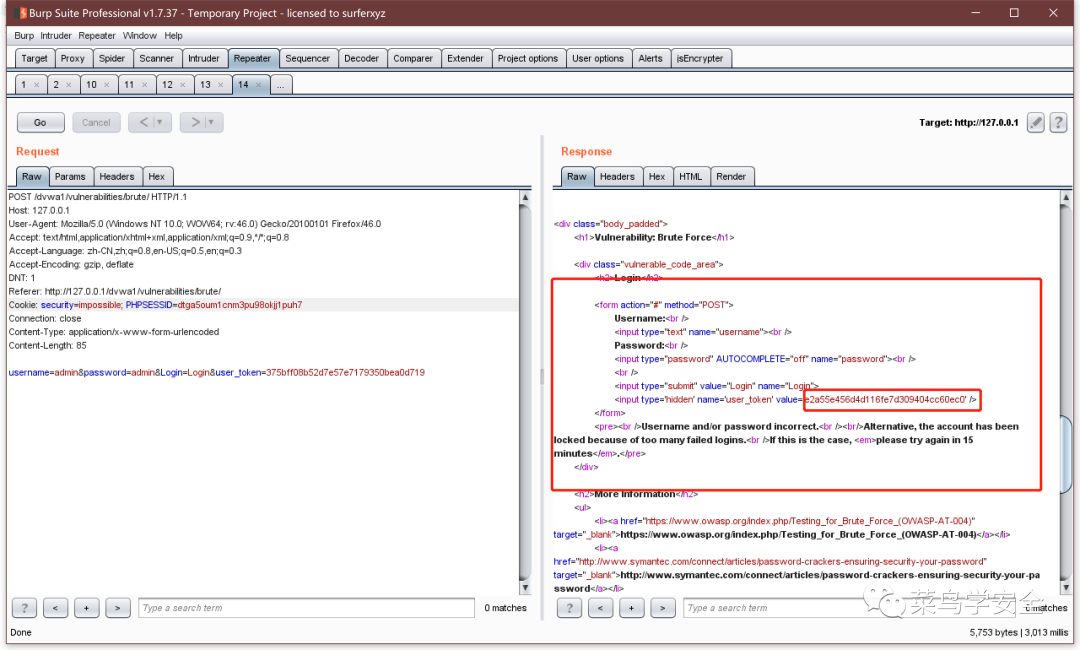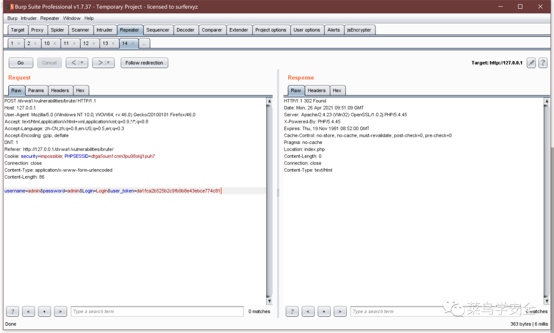 可以看到这里在输入用户名密码以后,携带了Token过去,验证用户密码完毕以后,再返回了一个Token,我们就可以利用返回的Token再次去尝试用户名密码,如果Token错误就返回302