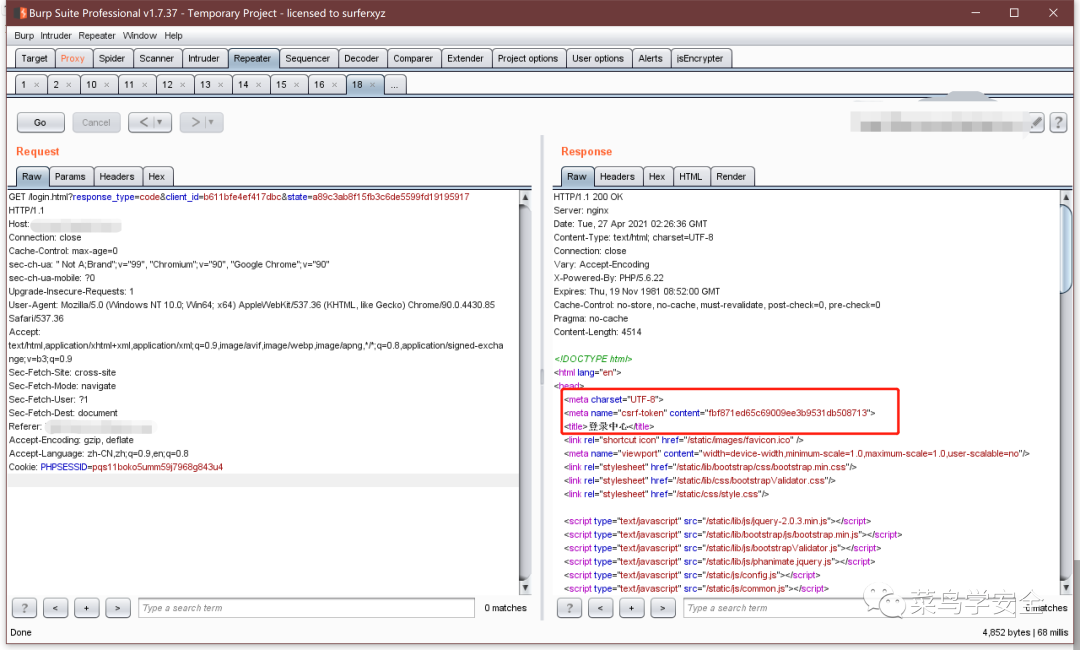 俗话说的好,没有实战的技术研究都么的屁用,这里就随便找了个网站测试一下,这里经过一顿瞎搞以后发现和上面的逻辑不太一样。dvwa的环境当中是在发送登录包以后就返回了Token,而这个网站在第一次访问页面时候返回了Token,在使用过以后他会刷新页面,重新获取Token。这样我们就没有办法和上面一样索引一个数据包当中的内容来反复利用了,变成了