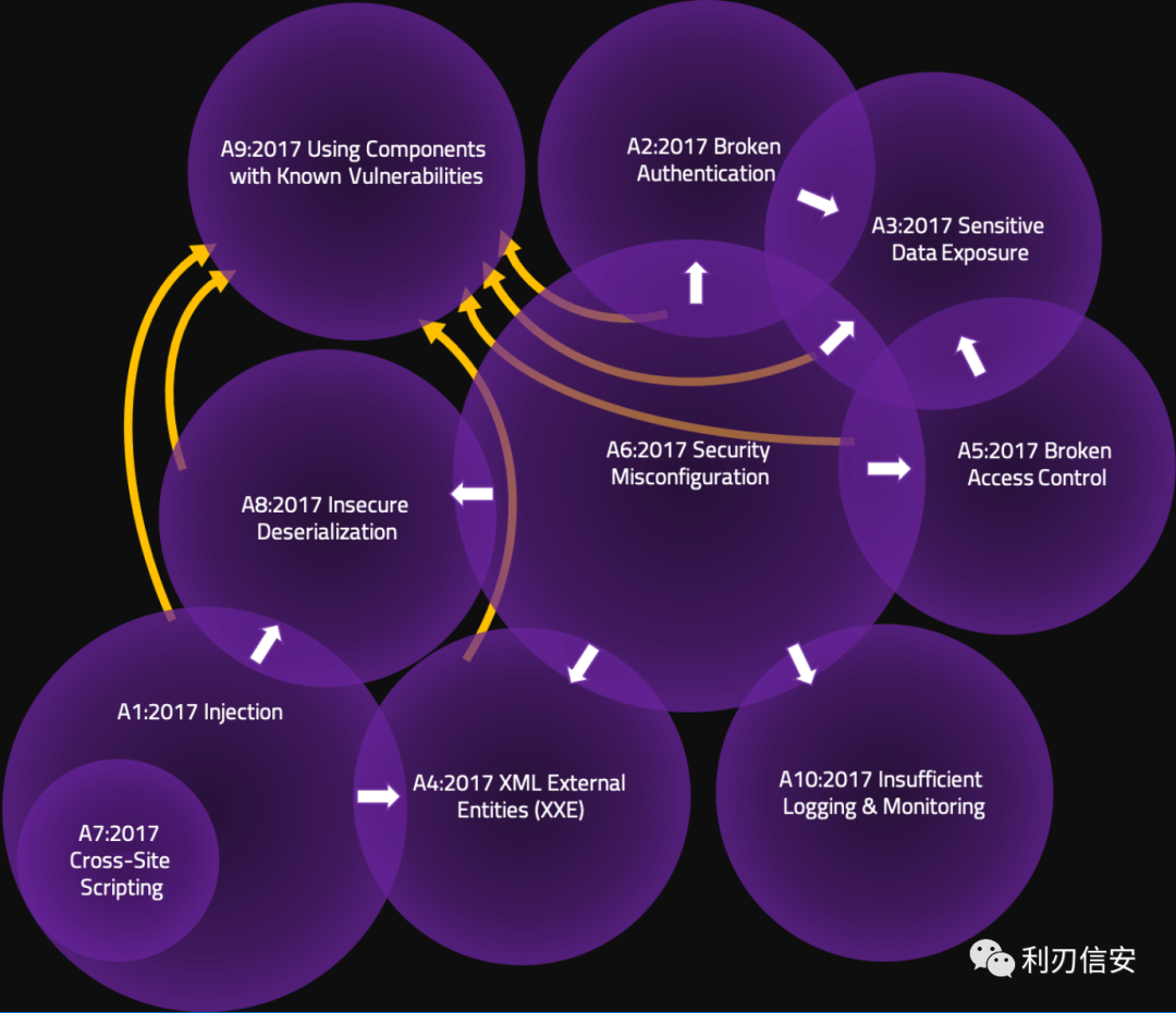 重叠仅在一个方向。我们通常会根据最终表现或“症状”而不是(可能很深的)根本原因对漏洞进行分类。例如,“敏感数据暴露”可能是“安全配置错误”的结果;但是,您不会从另一个方向看到它。因此,在交互区域中绘制了箭头以指示发生的方向。