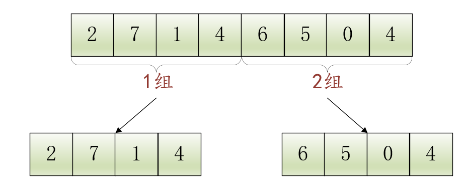 比方说某个数组有4个元素[2, 7, 1, 4],它的两个子数组都是有序的,分别是:[2, 7]和[1, 4],如下图所示: