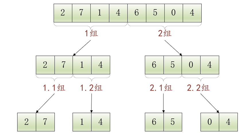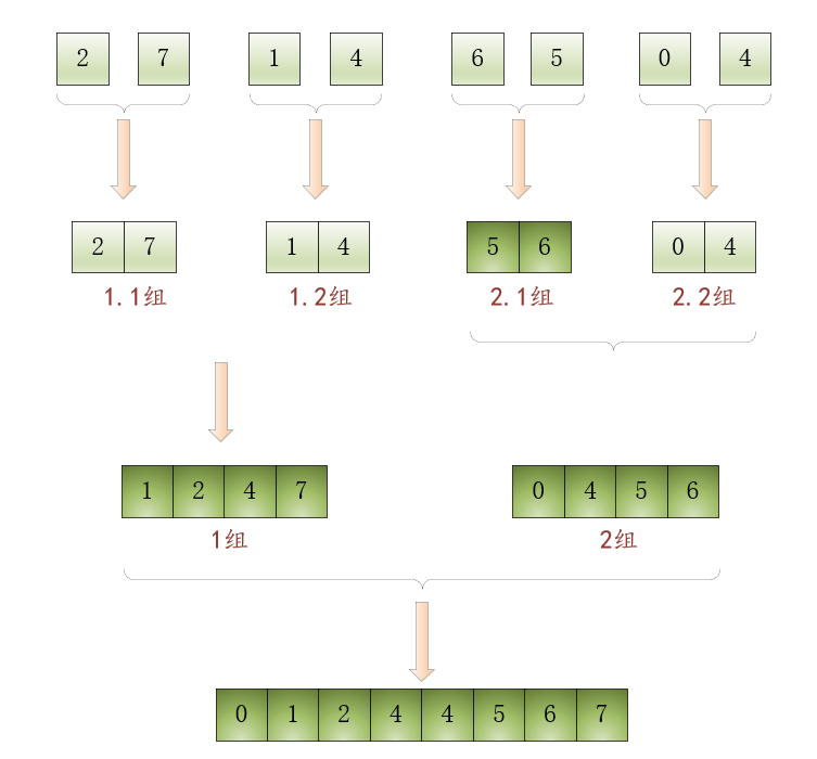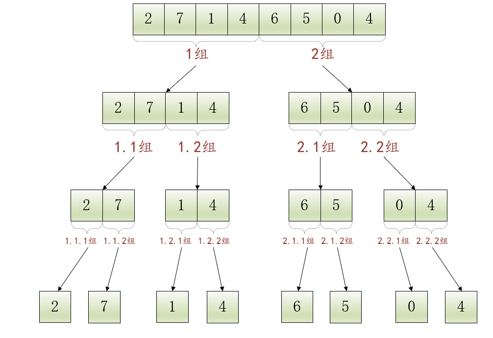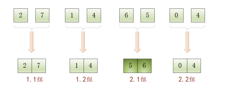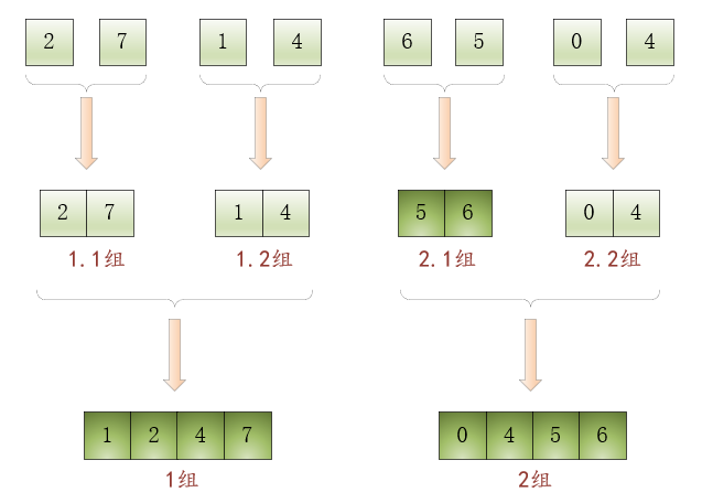 现在各个组仅包含1个元素,不能再拆分了,就可以对组中元素进行排序了。很显然,仅有1个元素的数组本身就是已经排好序的,也就是说:1.1.1组
