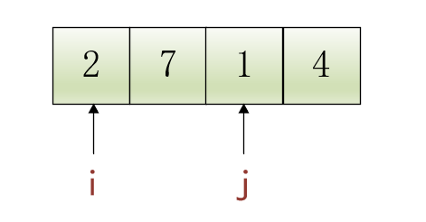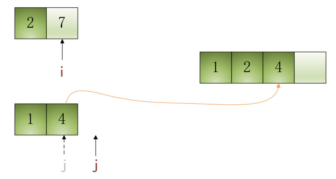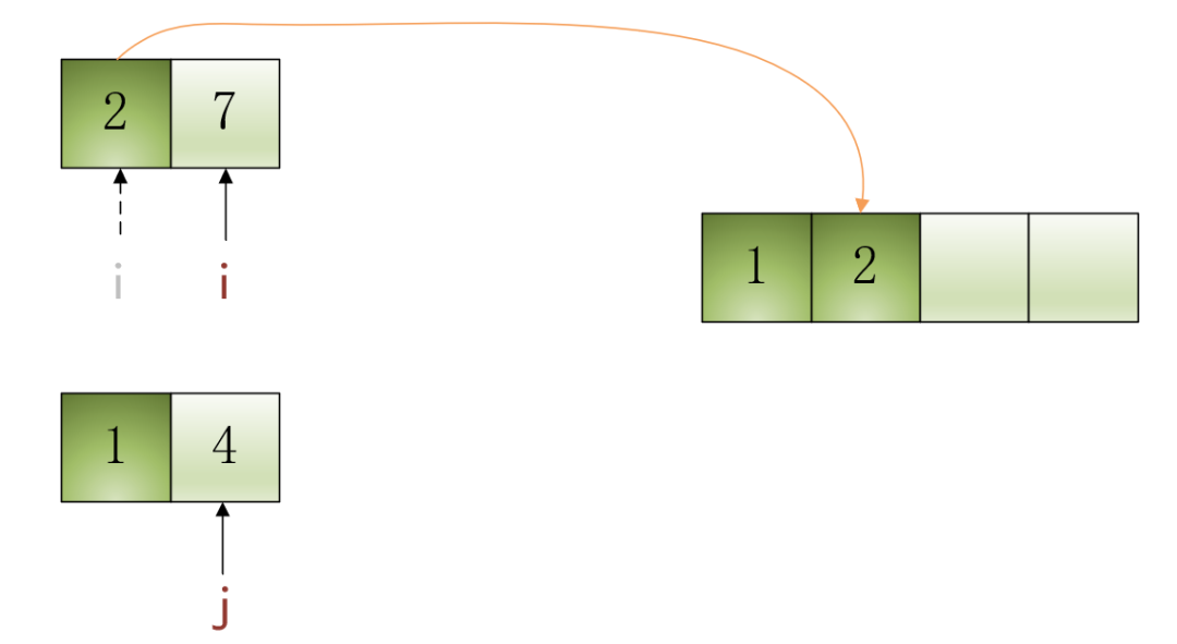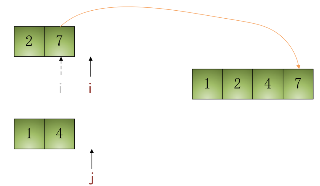 比方说有两个包含2个元素的已排序数组[2, 7]和[1, 4],我们想把这两个数组合并为一个大的有序数组,那么我们可以定义两个变量i