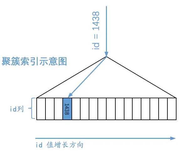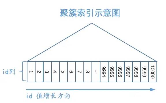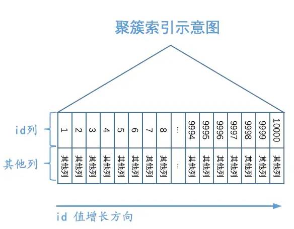 如图所示,我们把聚簇索引对应的复杂的B+树结构搞了一个极度精简版。可以看到,我们忽略掉了页的结构,直接把所有的叶子节点中的记录都放在一起展示,为了方便,我们之后就把聚簇索引叶子节点中的记录称为聚簇索引记录。虽然这个图很简陋,但是我们还是突出了聚簇索引一个非常重要的特点:聚簇索引记录是按照主键值由小到大的顺序排序的。当然,追求视觉上极致简洁的我们觉得图中的“其他列”也可以被略去,只需要保留id列即可,再次简化的B+树示意图就如下所示: