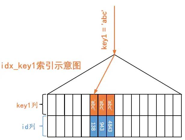 如果我们想查找key1值等于某个值的二级索引记录,那么可以通过idx_key1对应的B+树,很容易的定位到第一条key1列的值等于某个值的二级索引记录,然后沿着记录所在单向链表向后扫描即可。比方说我们想通过这个B+树定位到第一条key1值为'abc'的记录,那么示意图就如下所示: