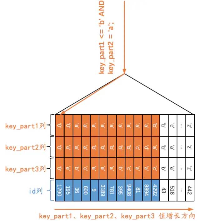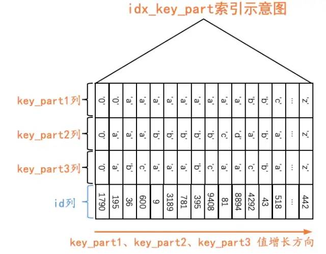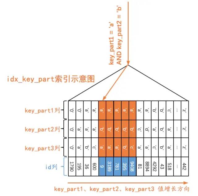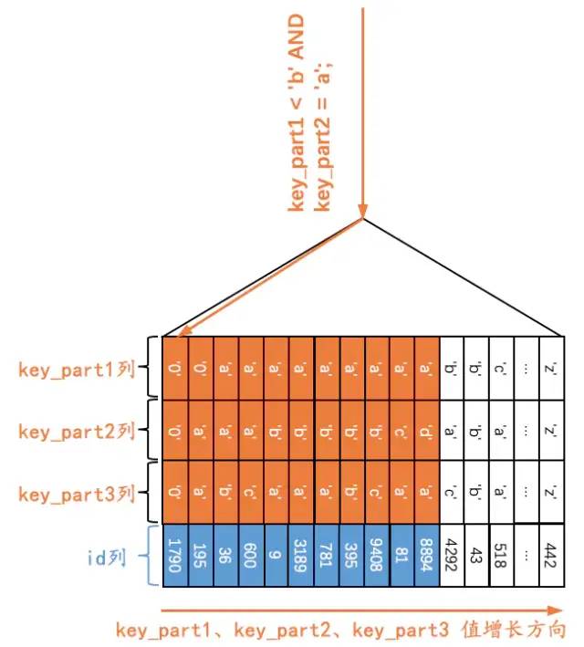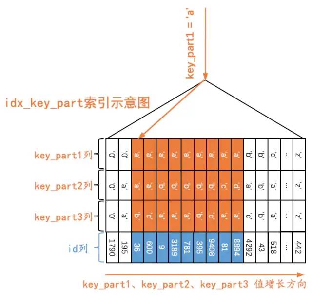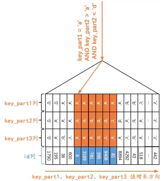 在key_part1和key_part2列的值都相同的情况下,再按照key_part3列的值进行排序。
