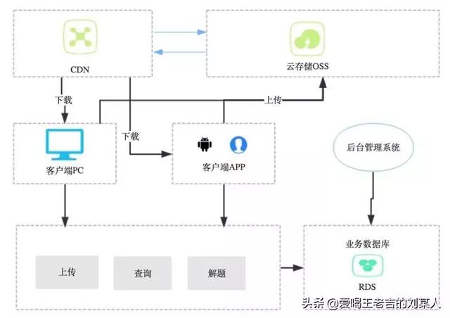 如上图所示,这种模式较单库单应用模式多了一个CDN、一个云存储OSS(七牛、又拍等雷同)。一个典型的应用流程(以用户上传、查看图片需求为例)如下: