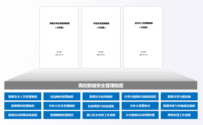 制度体系建设,主要是输出数据安全相关的管理规范。比如数据分类分级制度、开发安全管理制度、合作方人员管理制度等。制度体系是数字化改革“152”体系中的重要组成部分,也是《数据安全法》、《个人信息保护法》、以及教育部《关于加强教育系统数据安全工作的通知》的要求,更是技术体系落地的重要依据和保障,非常重要。