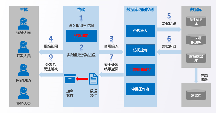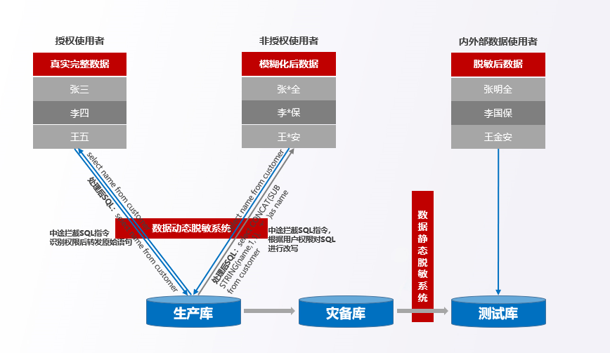 “看不见”,简单来说就是利用静态脱敏与动态脱敏技术实现数据的可用不可见。运维场景下,对生产库的访问不可避免,利用动态脱敏技术解决数据实时访问问题,不影响运维操作的同时,对结果中的敏感数据进行遮盖,防止数据泄漏。