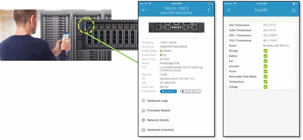 用户可以在Android和iOS手机/平板上下载安装OMM(OpenManageMobile)APP,和服务器建立BLE/Wi-Fi连接后,即可轻松地通过手机/平板,查看服务器资源清册、运行状况和日志,甚至进行重启服务器操作(需选购含QuickSync 2 模块的面板)。