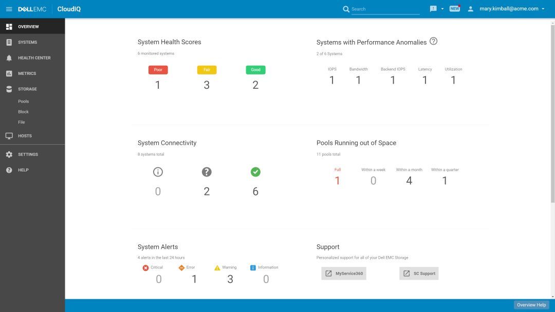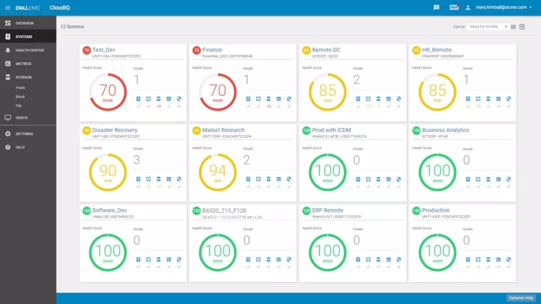 戴尔易安信CloudIQ好比一个适用于戴尔易安信存储系统的健身跟踪器,可监视、分析用户存储环境的运行状况,适用于戴尔易安信旗下多个存储产品,包括戴尔易安信Unity、SC系列、XtremIO、以及PowerMax/VMAX。