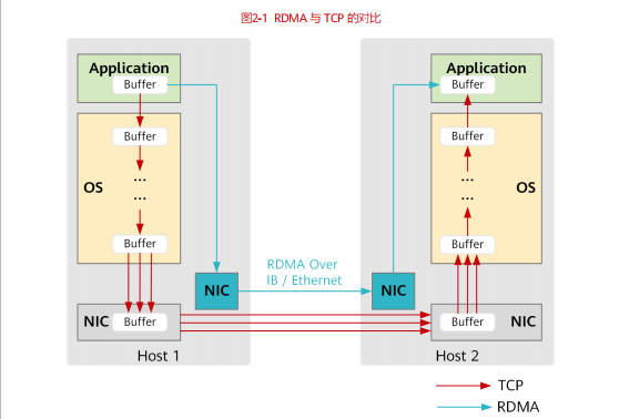 RDMA 允许应用与网卡之间的直接数据读写,将服务器内的数据传输时延降低到接近 1μs。同时,RDMA 允许接收端直接从发送端的内存读取数据,极大地减少了 CPU 的负担。