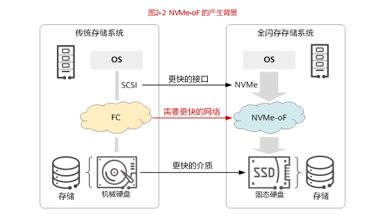 相比而言,原来承载存储业务的 FC 网络,无论从带宽还是时延上,均已经成为当前存储网络的瓶颈。完成革新后的全新存储系统,需要一个更快、更高质量的网络。为此,存储与网络从架构和协议层进行了深度重构,新一代存储网络技术 NVMe over Fabric(简称 NVMe-oF)应运而生。NVMe-oF 将 NVMe 协议应用到服务器主机前端,作为存储阵列与前端主机连接的通道,可端到端取代 SAN 网络中的 SCSI(Small Computer System Interface,小型计算机系统接口)协议。