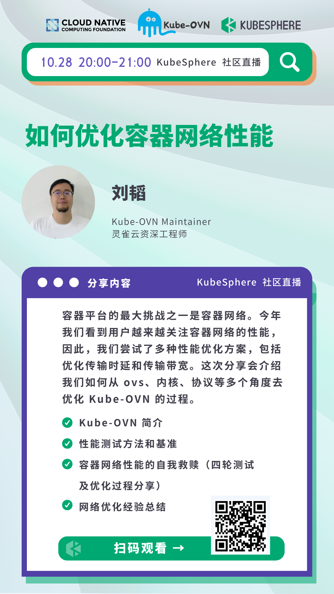 今年我们看到用户越来越关注容器网络的性能,因此,我们尝试了多种性能优化方案,包括优化传输时延和传输带宽。这次分享会介绍我们如何从 ovs、内核、协议等多个角度去优化 Kube-OVN 的过程。