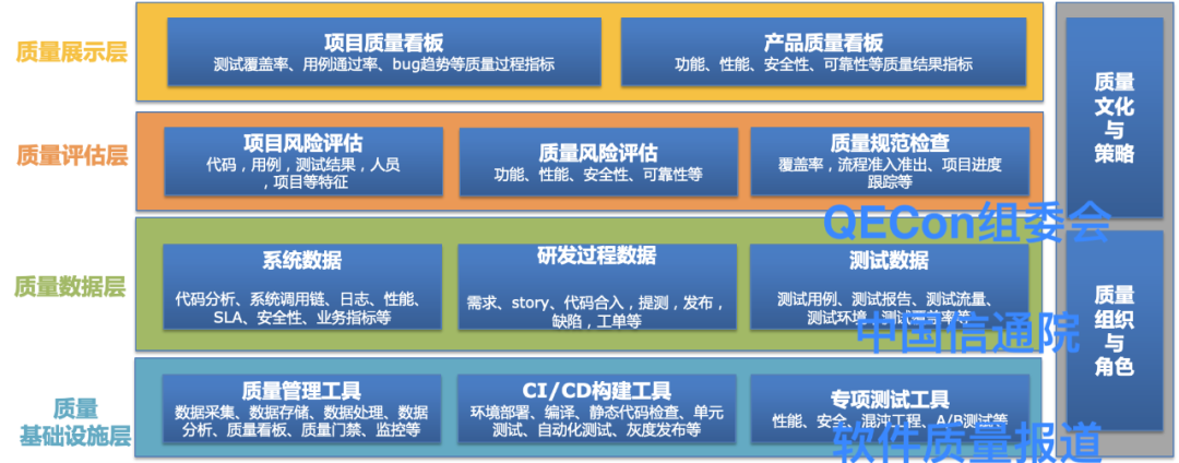 质量工程架构将质量保障体系,分成了基础设施、数据、评估、展示、文化、组织六个维度,指导和帮助企业围绕产品交付全生命周期,系统性的开展质量保障工作,以及完成质量活动的数字化转型。
