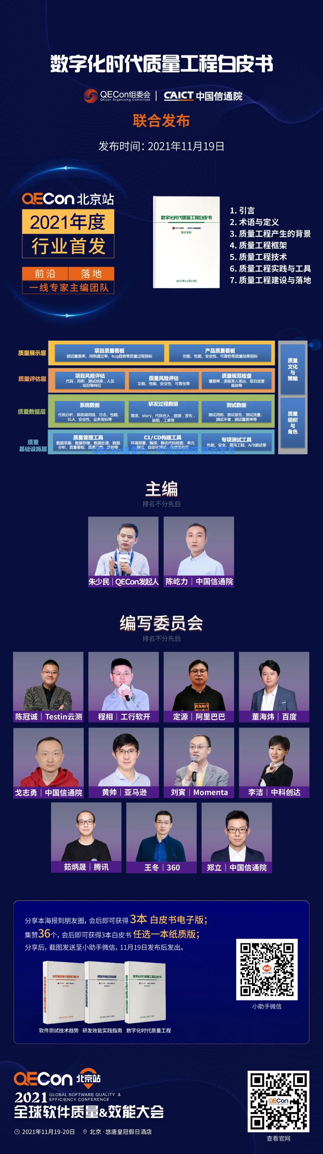 在此背景下,编写委员会希望通过编写本白皮书,帮助大家重新认识质量工程的价值,系统、深入地介绍数字化时代下质量工程的新内涵,以及如何在企业和团队内实施,并给出相关的方法、技术、工具和优秀实践等,真正推动质量工程在更广泛范围内的落地,消除目前存在的“软件测试这个最大瓶颈”,更好地实现持续交付以满足变化日益增强的业务需求和客户需求。