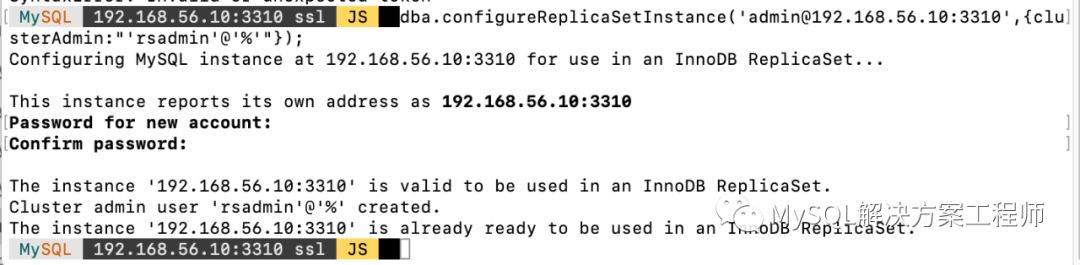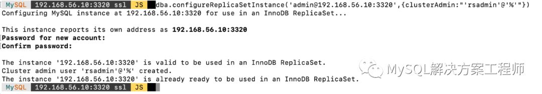 连接后执行dba.configureReplicaSetInstance() 对其进行配置,在这里需要设置一个用于全部节点的账户(账户必须在全部节点上一致)