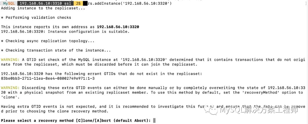 执行加入复制集操作后,会提示使用哪种方式进行数据恢复(克隆或增量),由于我的两台节点数据不一致,我选用的克隆方式,此方式会将从节点上的数据完全删除。