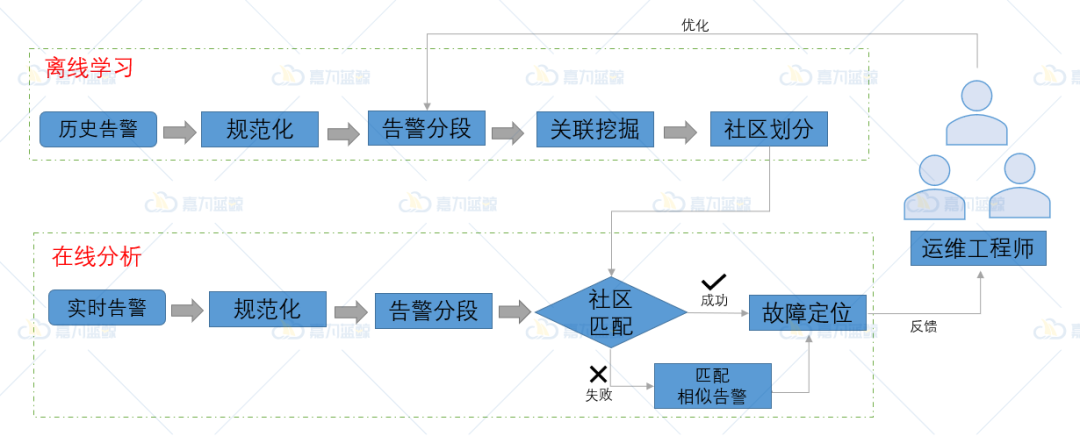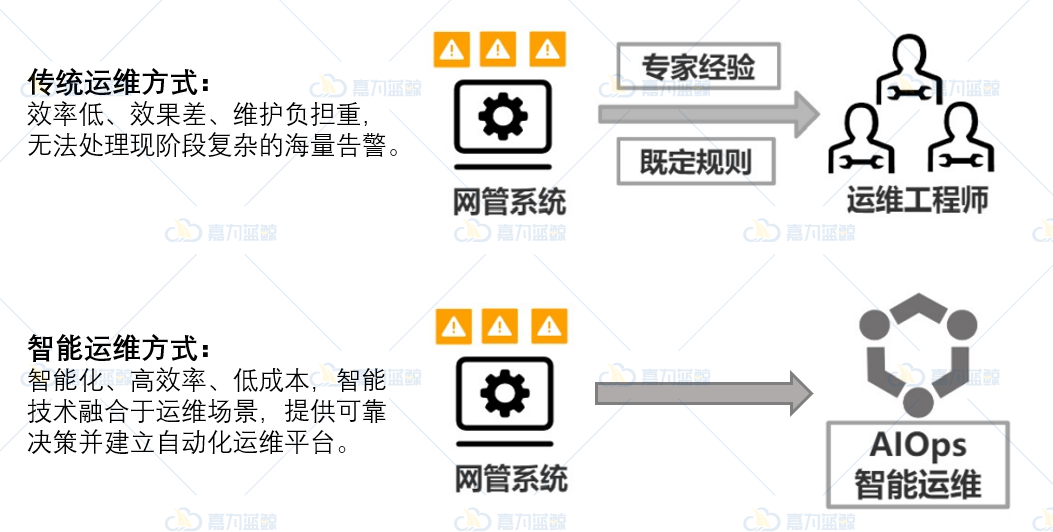 AIOps,即 Artificial Intelligence for IT Operations,智能运维。随着智能化时代的快速发展,企业内服务系统的数量不断增加,系统之间的关系也越来越复杂。如图,在传统运维方式中,运维工程师难以快速准确地对海量告警做出正确判断,导致服务停滞,并造成不可逆的损失。在AIOps智能运维下,智能化的判断告警故障定位非常值得深入探索。