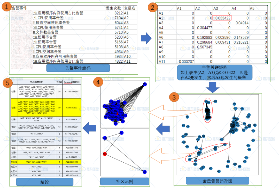 对获取到的原始告警数据进行规范化处理如清除脏数据、分词等;对不同的告警事件进行编码,如将“XXX的CPU发生告警,CPU使用率达到90%”设为A1。