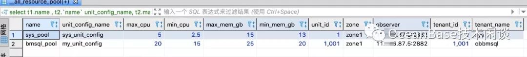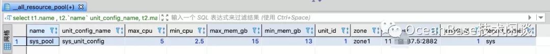 select t1.name resource_pool_name, t2.`name` unit_config_name, t2.max_cpu, t2.min_cpu, round(t2.max_memory/1024/1024/1024) max_mem_gb, round(t2.min_memory/1024/1024/1024) min_mem_gb, t3.unit_id, t3.zone, concat(t3.svr_ip,':',t3.`svr_port`) observer,t4.tenant_id, t4.tenant_name