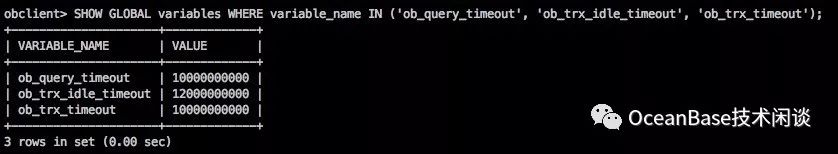 SHOW GLOBAL variables WHERE variable_name IN ('ob_query_timeout', 'ob_trx_idle_timeout', 'ob_trx_timeout');