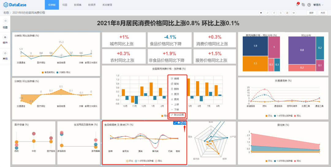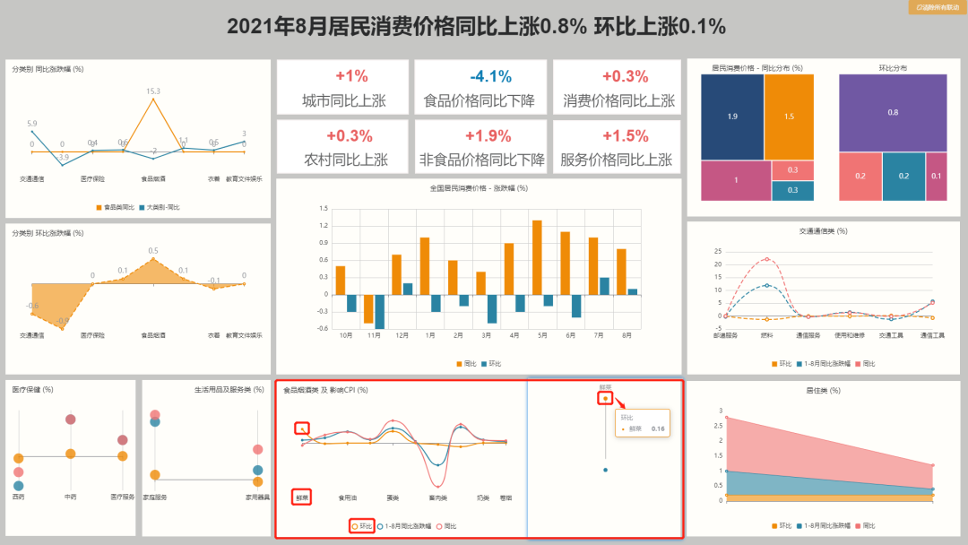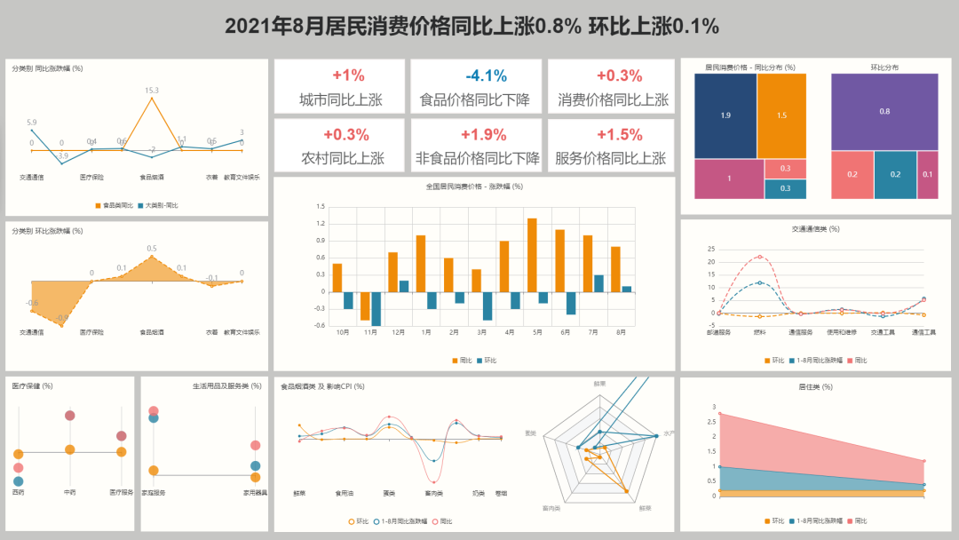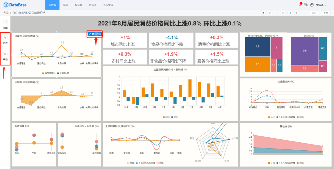 最近使用DataEase做了一组2021年8月居民消费价格数据分析的图表。DataEase是开源的数据可视化分析工具,可以帮助用户快速分析数据并洞察业务趋势,实现业务的改进与优化。DataEase支持丰富的数据源连接,能够通过拖拉拽方式快速制作图表,并且可以方便的与他人分享。