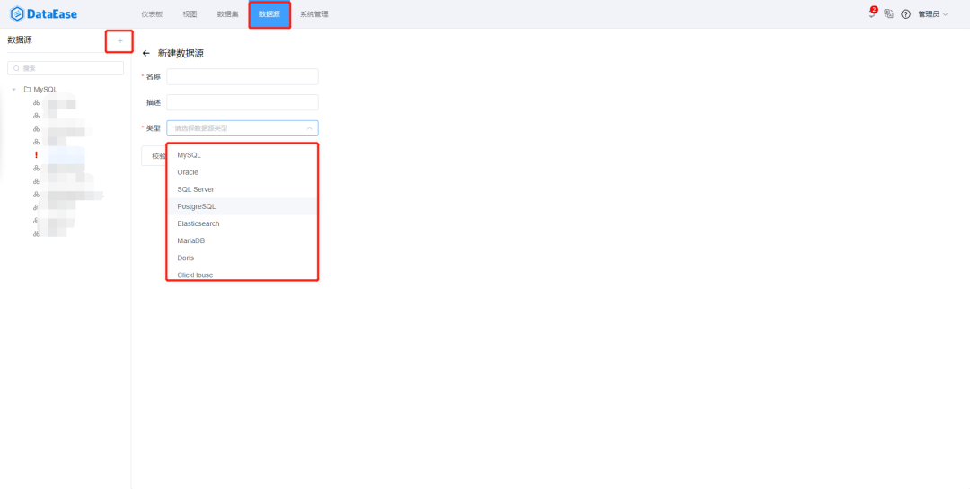按照此操作把所有数据集导入进来。除了使用Excel文件,还可以通过数据库导入数据集。DataEase支持MySQL、Oracle、SQL Server、PostgreSQL等多种数据源。