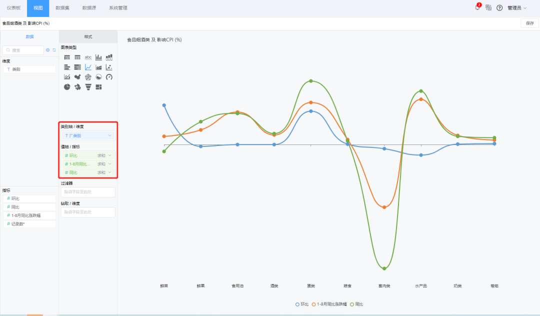 导入数据后,把维度和指标拖拽到对应的类别轴和值轴里,右侧生成图表。
