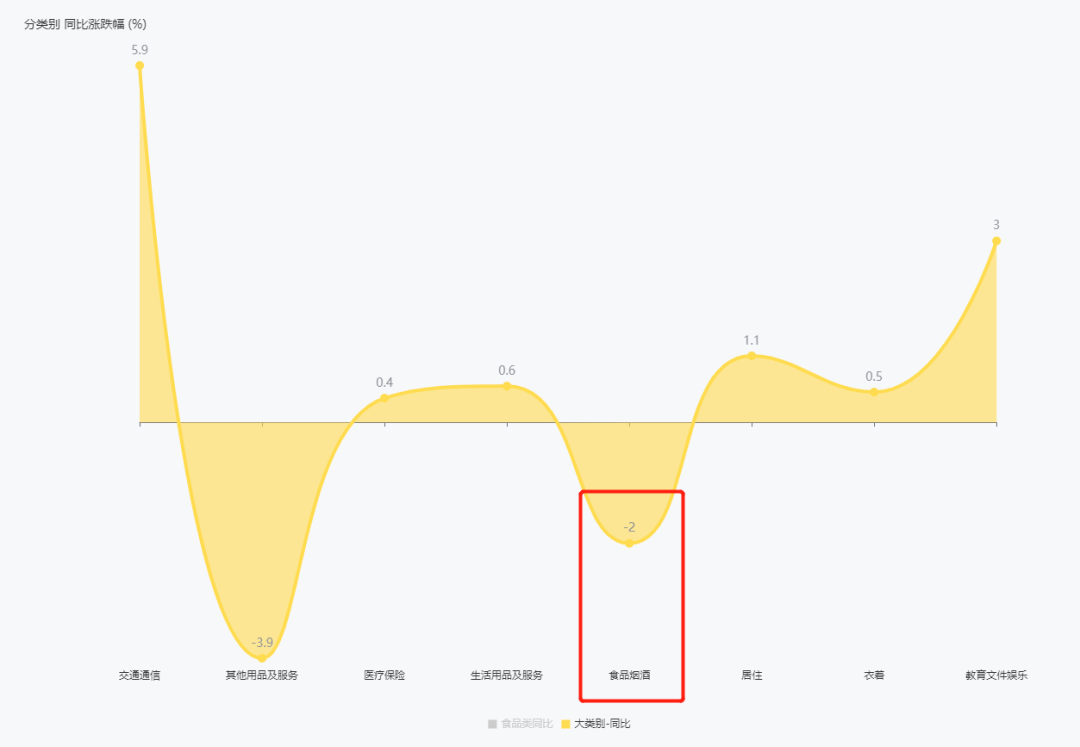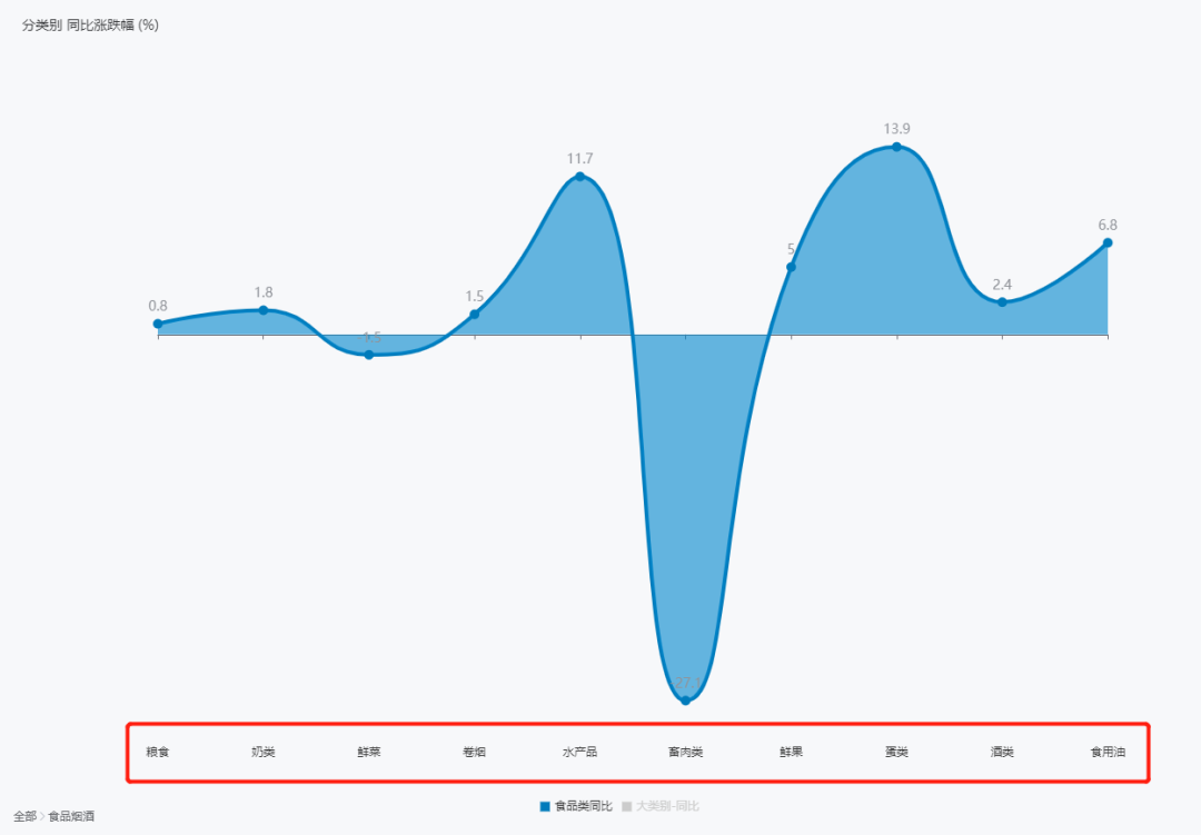 下钻结果如下图,展示食品烟酒类别下所有的二级分类数据。如果想返回上一级,可点击视图左下角的“全部”选项,返回一级视图。