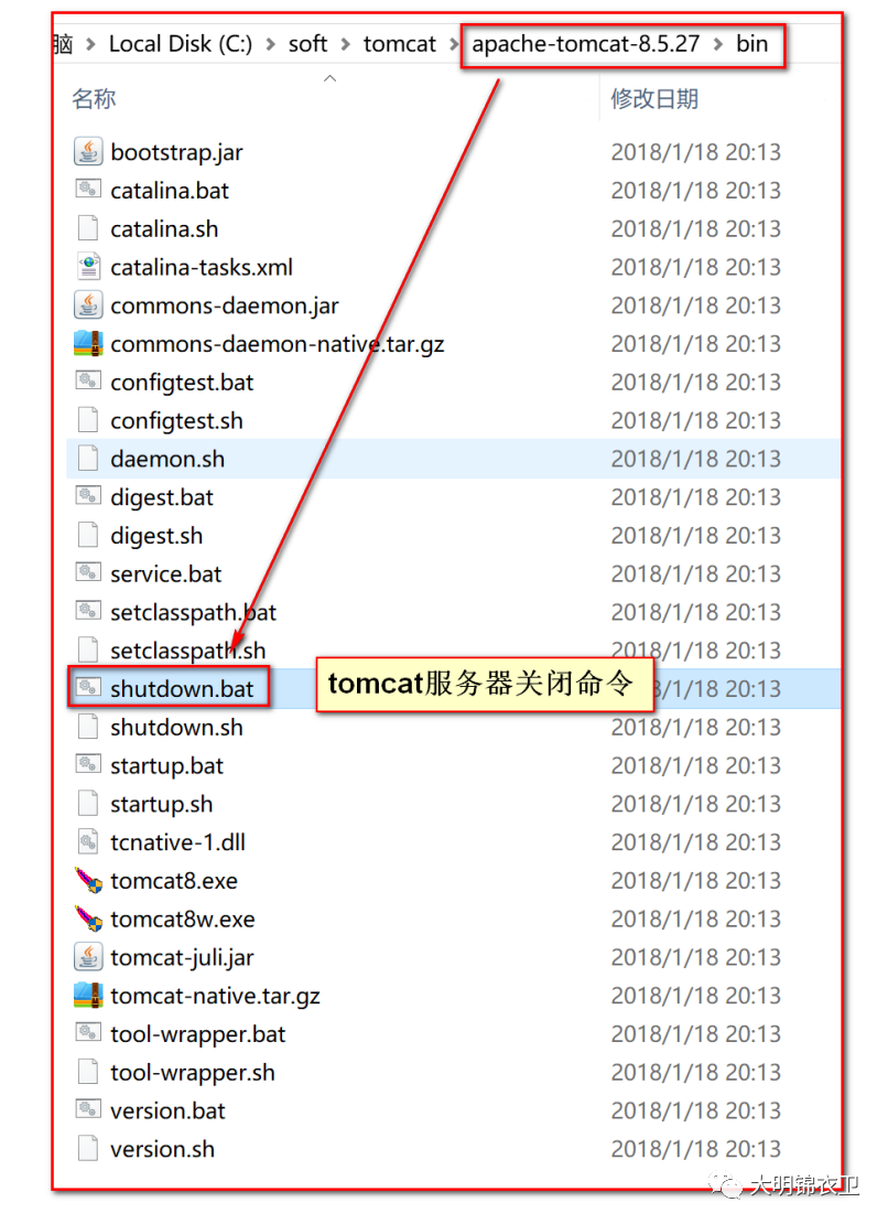 常用方式1:查找tomcat目录下bin目录,查找其中的shutdown.bat命令,双击关闭服务器: