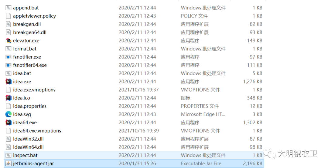①然后将下载的文件中的jetbrains-agent.jar放到你的IDEA安装目录的bin目录下