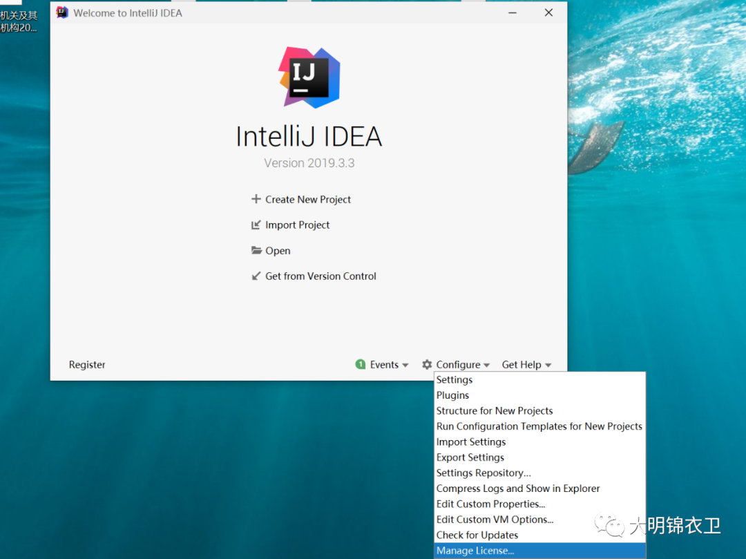 ⑥打开【注册码】文本,把里面的注册码全部复制。打开IDEA,可以选择跳过那些运行指引,然后进入到下图的界面,选择【Configure】下方的【Manage License】
