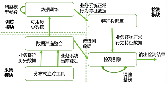 数据训练模块。利用机器学习或统计学的方法,训练出业务系统中的正常行为,并生成与业务系统正常行为匹配的特征数据。在训练过程中,需要根据专家知识对训练结果进行检验并不断调整训练模型的参数。