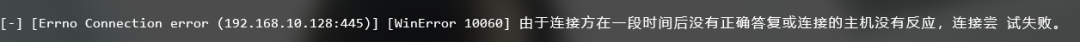 [-] [Errno Connection error (xx.xx.xx.xx:445)] [WinError 10060] 由于连接方在一段时间后没有正确答复或连接的主机没有反应,连接尝 试失败。