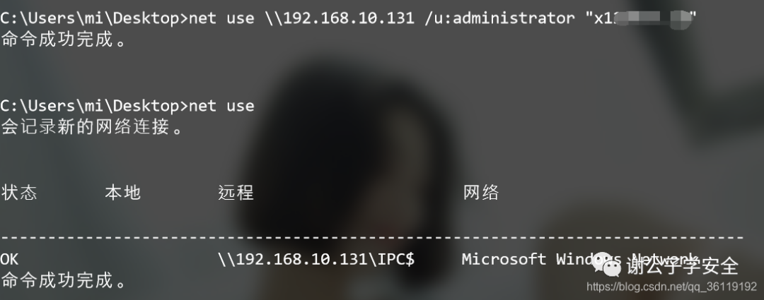建立IPC$非空连接net use \\192.168.10.131 u:"administrator" "密码"