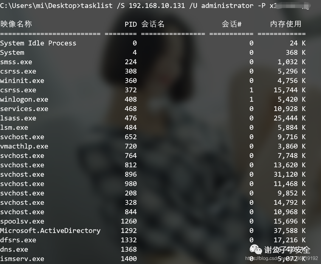 tasklist /S 192.168.10.131 /U administrator -P 密码