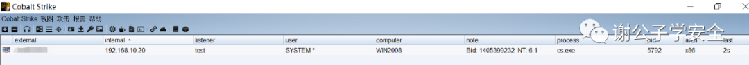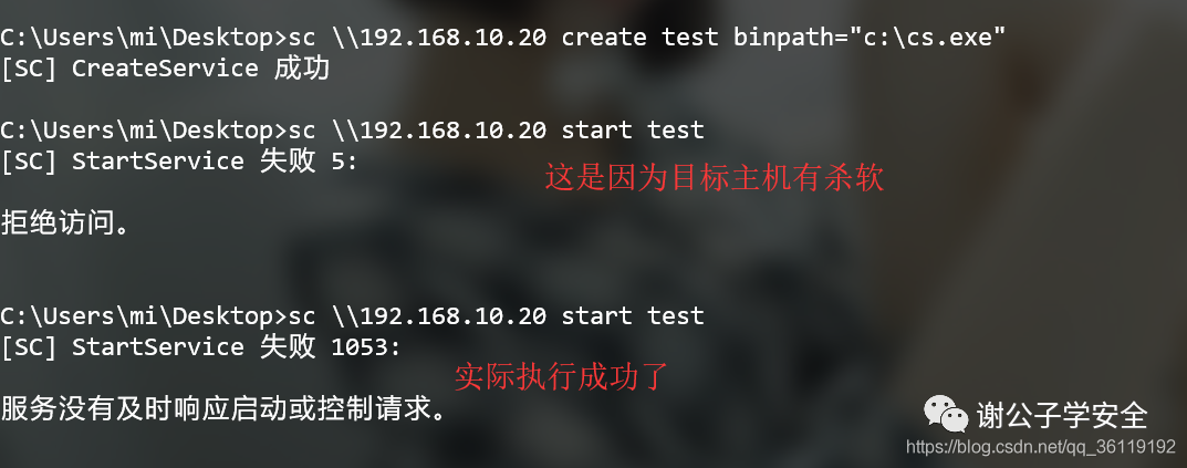 在目标主机上创建一个名为test的计划任务,启动程序为C:\vps.exe,启动权限为system,启动时间为每隔一小时启动一次schtasks /create /s 192.168.10.131 /tn test /sc HOURLY /mo 1 /tr c:\vps.exe /ru system /f其他启动时间参数:/sc onlogon 用户登录时启动/sc onstart 系统启动时启动/sc onidle 系统空闲时启动查询该test计划任务schtasks /query | findstr test启动该test计划任务schtasks /run /s 192.168.10.131 /i /tn "test"删除该test计划任务schtasks /delete /s 192.168.10.131 /tn "test" /fsc命令创建计划任务copy test.exe \\192.168.10.20\c$sc \\192.168.10.20 create test binpath= "c:\test.exe"sc \\192.168.10.20 start testsc \\192.168.10.20 del test