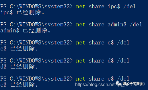 net share ipc$ /delete 关闭ipc默认共享net share c$ /delete 关闭C盘默认共享net share admin$ /delete 关闭admin$默认共享