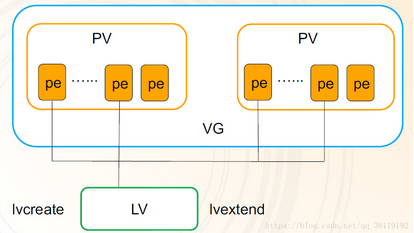 PV(Physical Volume) 物理卷,物理卷可以由整个硬盘也可以是独立分区转化而成。物理卷包括了许多默认大小为4MB的PE(Physical Extent)基本单元