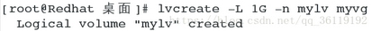第四步:在已有的卷组中,创建逻辑卷,lvcreate -L 1G -n mylv myvg 。