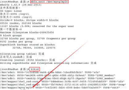 给逻辑卷分配文件系统 mkfs.ext4 dev/myvg/mylv ,并且 blkid 查看信息。Linux中默认将所有逻辑卷链接到 dev/mapper/ 目录下。/dev/mapper/myvg_mylv 是 dev/myvg/mylv 是软连接