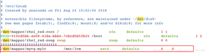 第五步:修改/etc/fstab 文件,将逻辑卷挂载信息加进去。