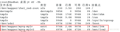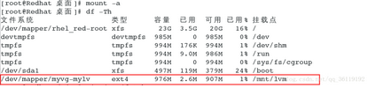 mount -a 重新挂载,df -Th 查看,可以看到,我们的 dev/mapper/myvg-mylv 已经成功挂载上了
