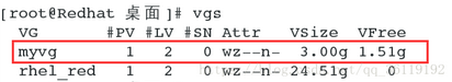 第一步:拉伸之前,先用vgs查看卷组中剩余空间的大小,可以看到,我们还剩余1.5G